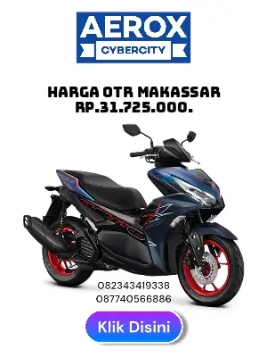 Harga dan angsuran aerox 155 untuk bulan januari 2026 berlaku di kota Makassar dan sekitarnya. Pertama, All new Aerox 155 adalah motor maxi sport scooter dengan 3 varian atau tipe. All New Aerox 155 adalah varian pertama, kemudian Aerox Cybercity dan yang terakhir adalah Aerox 155 Abs.Namun berbeda dengan Nmax juga Xmax Connected bahkan Xmax Tech Max, Aerox adalah scooter dengan desain sport yang aerodinamis. Namun kami ingin menyampaikan program untuk motor Aerox adalah promo cashback hingga 1,5 juta rupiah. Selain itu ada juga potongan 1 hingga 5 bulan untuk pembelian kredit motor aerox 155 melalui nomor WA marketing kami 082343419338.