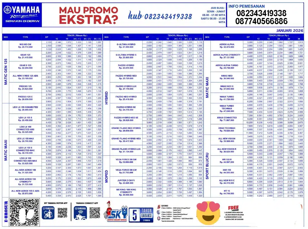Masih seperti bulan sebelumnya, Nmax menjadi motor yamaha di posisi pertama yang paling laris di Indonesia bahkan mancanegara.Kemudian di posisi kedua adalah Yamaha Fazzio terutama varian Fazzio Hybrid dengan promo Dp mulai Rp.600.000. Dan yang terakhir adalah motor yamaha Gear 125 dengan promo uamg muka atau Dp mulai Rp.400.000. Bahkan ada juga promo potongan 1 hingga 5 bulan untuk pembelian kredit yang bisa anda pilih melalui gambar detail berikut: